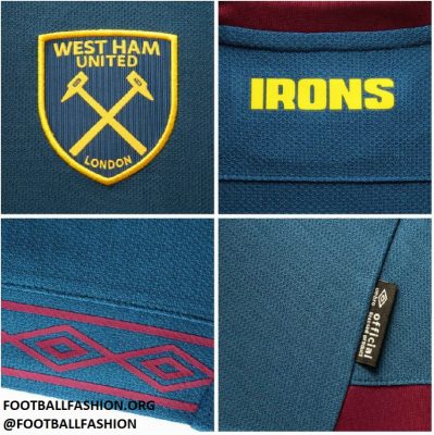 West Ham United’s 2018/19 home and away kits use brand new rounded neck designs from Umbro with the Manchester brand’s iconic diamonds adding detail to their sleeves.