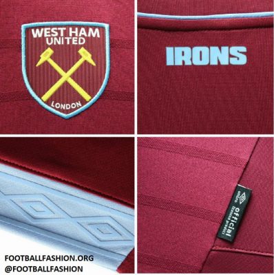 The 2018/19 home shirt features a traditional Claret body and sleeves with a Sky Blue neckline and cuffs, a full-colour West Ham United crest, an IRONS graphic on the back of the neck and the classic Umbro stacked diamond motif. The kit will be completed by classic White shorts and socks.