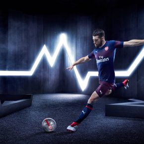 The shirt sports a unique “pulse” design across the chest and the accompanying shorts come in a heather effect created by mixing both the ‘Peacoat Navy’ of the away shirt with the red of the home shirt.