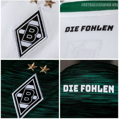 Both shirts uses new modern crewneck designs from PUMA. The home jersey is in Mönchengladbach’s famous white with dark green accenting at its collars, sleeves and shoulders, The way shirt combines black and dark green via a contemporary burnout effect. “DIE FOHLEN” is printed on the signoff areas of both kits.