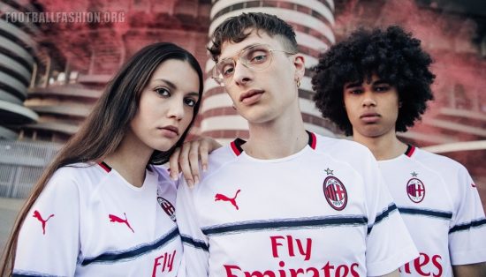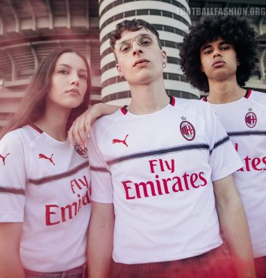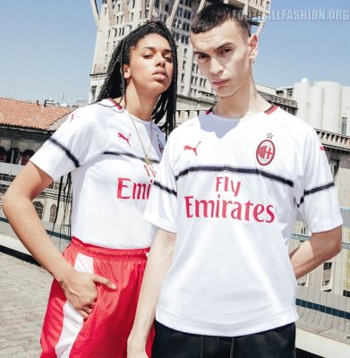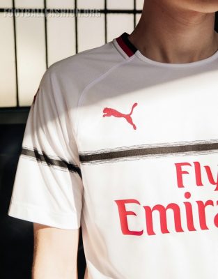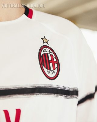 The shirt features a round neck collar with red and black detailing, a black line graphic across the chest, back and arms reminiscent of the 90’s era Milan away kits and the ‘Diavolo Rossonero’ (The Red & Black Devil) on the back of the neck. The shirt will be accompanied by all-white shorts and white socks with a red and black band on the trim.
