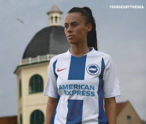 The Seagulls 18/19 home kit uses Nike’s now omnipresent Vapor football shirt design in the club’s well-known blue and white stripes. This year’s stripes are their widest since Brighton’s 2013/14 season.