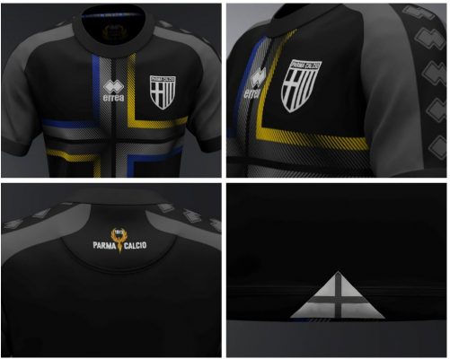 Parma Calcio 1913’s 2018/19 Errea third shirt carries a modern crewneck design in black and gray. It has an equally contemporary version of the club’s shirt cross on its front that includes blue, yellow, black and shades of gray along with a series of diagonal pinstripes.