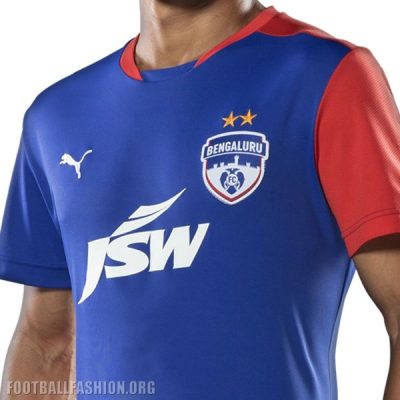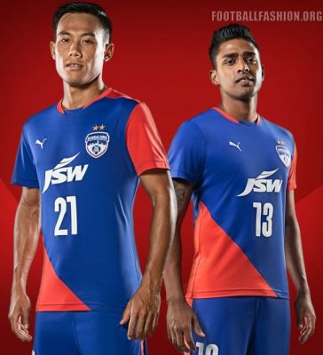 The Indian Super League side captained by domestic legend Sunil Chhetri is wearing a mainly blue home jersey with orange details at its collar, left sleeve and shoulder, and lower right.
