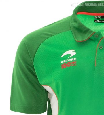 The Basque Country’s 18/19 primary jersey uses a bespoke modern polo collar design from Astore. Its collar and side area feature a darker shade of green that the rest of the shirt. Red is sed for trim at the flanks and collar and for the inside neck taping.