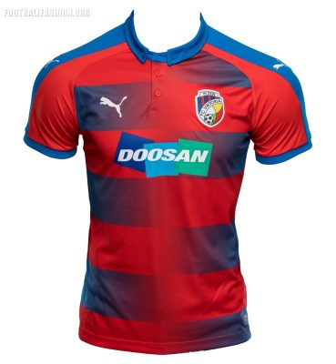 The FC Viktoria Plzeň 18/19 PUMA jersey was launched with the theme “Elegance – Tradition – Functionality”. It uses one of PUMA’s current polo collared football shirt designs. It has a red base with broken blue horizontal stripes on its front.