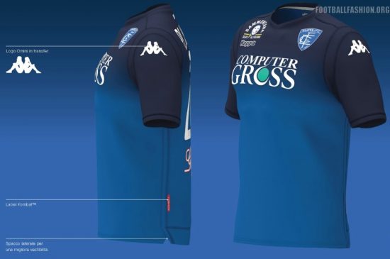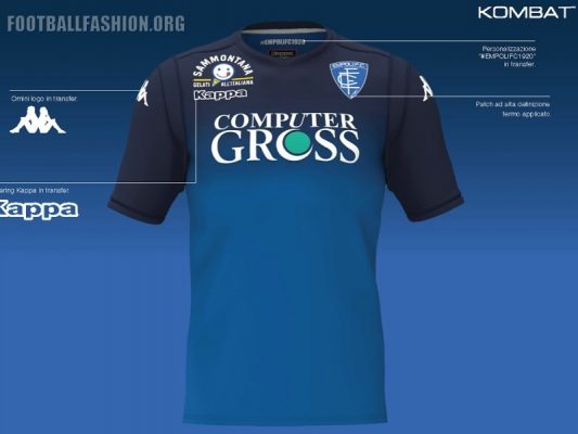 The Empolic FC 2018/19 home, away and third kits use a v-neck version of Kappa’s Kombat 2019 tempate. The home shirt is in Empoli’s usual blue with a gradient effect that blends a navy blue upper chest / shoulder / sleeve area with royal blue from the mid-chest down.