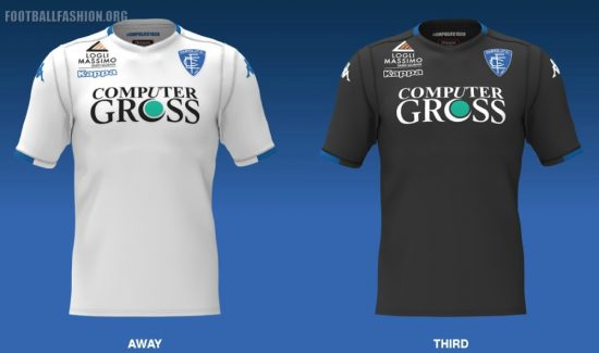 Empoli’s 18/19 away jersey is white with blue accents while their third kit is black with blue details. All three shirts have “EMPOLI 1920” printed on their inside necklines and “EMPOLI F.C.” on their signoff areas. Kappa’s Omini logos appear on the upper sleeves.