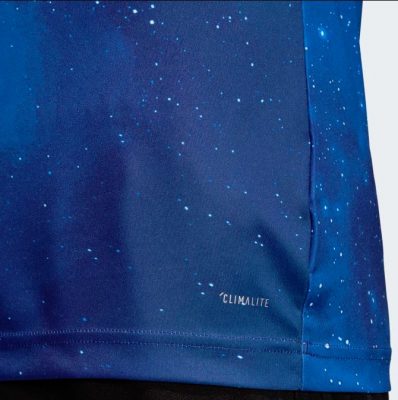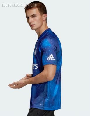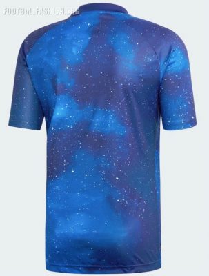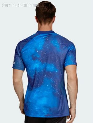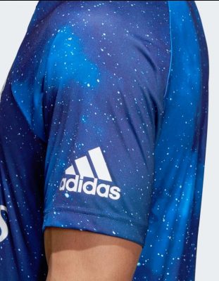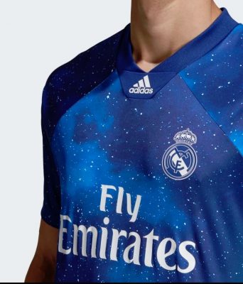 Real Madrid’s first ever physically available digital shirt uses a 1990s design with a modern silhouette. The shirt uses two shades of blue intended to look like the night sky with a series of white stars in it.