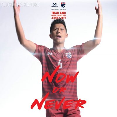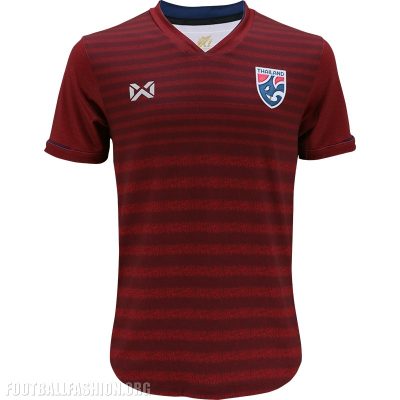 The new Thai away kit is red with a series of tonal horizontal stripes on its front. The width of the stripes increase on the lower two thirds of the jersey.