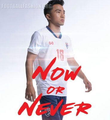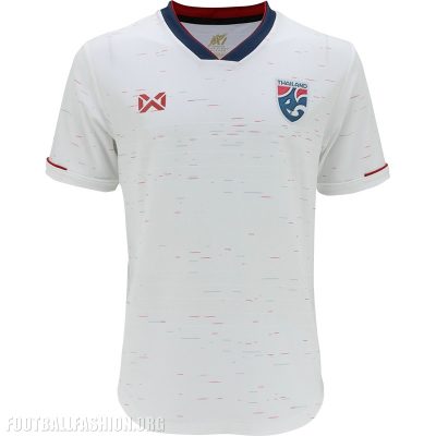 Thailand’s 2019 Warrix third kit is mainly white with a blue and red collar. Red and blue dashes run along its front while red inserts appear just above the sleeve cuffs.