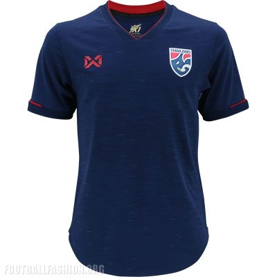 The Thailand 2019 jerseys use a new bespoke design from Warrix with a ribbed v-neck. The home kit is in the customary blue of the The War Elephant with red collar and sleeve detailing. A series of subtle small lines in white and a darker shade of blue than the rest of the shirt add additional accenting.