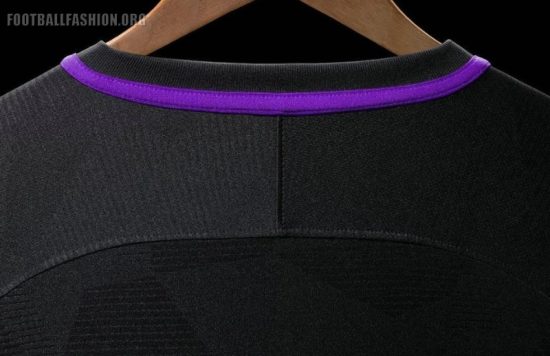 Al-Ain’s 2018/19 third kit is all black with purple accents at its collar and underarms. It has a series of subtle horizontal pinstripes and a tonal camouflage effect throughout.