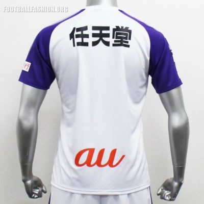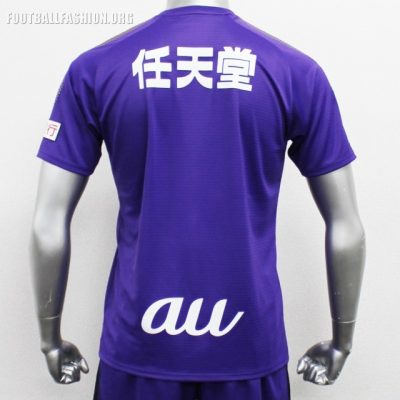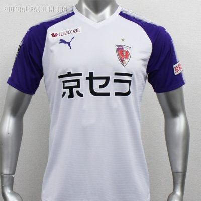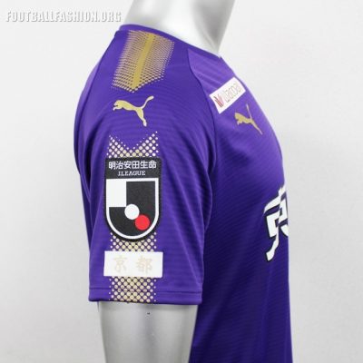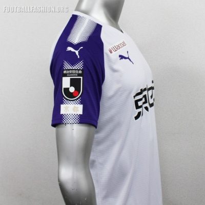 The Kyoto Sanga 2019 home and away kits use a v-neck jersey design from PUMA in the club’s customary primary purple and alternate white. Stylized versions of PUMA’s T7 stripes run along their sleeves and shoulders.