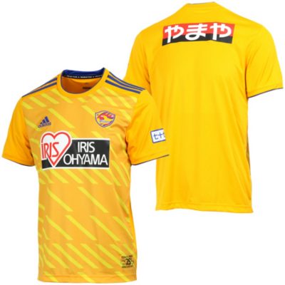 In home yellow and way white, the Vegalta Sendai 2019 jerseys use a new rounded neckline design from adidas. The most prominent feature of the shirts are a series of short diagonal lines on their fronts.