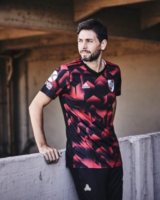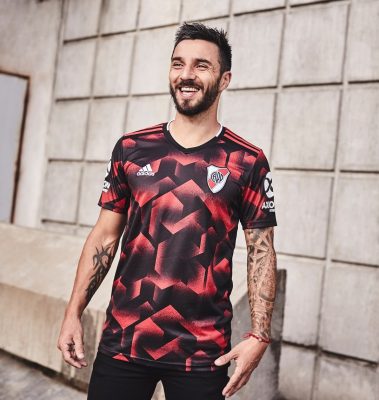 The River Plate 2019 third kit features a modern design on its front made up red and black shapes and grafitti-inspired spray paint effects. Its back is all black.
