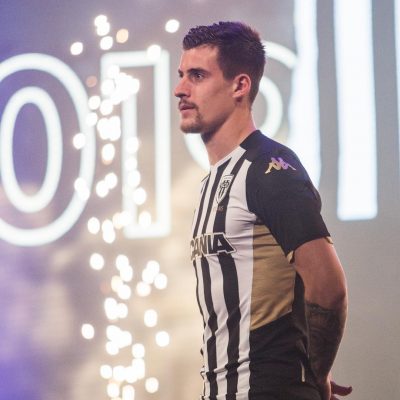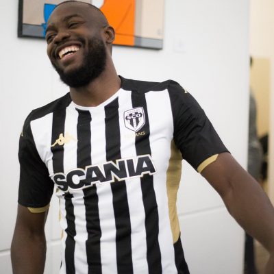 Both use a new modern Kappa design based on a v-neck template. The home shirt is in the usual black and white vertical stripes of the club from the west of France.