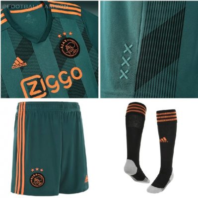 The AFC Ajax 19/20 away jersey uses adidas’ new Striped 19 design. The shirt is mainly green with four stripes on the front made up of black pinstripes.