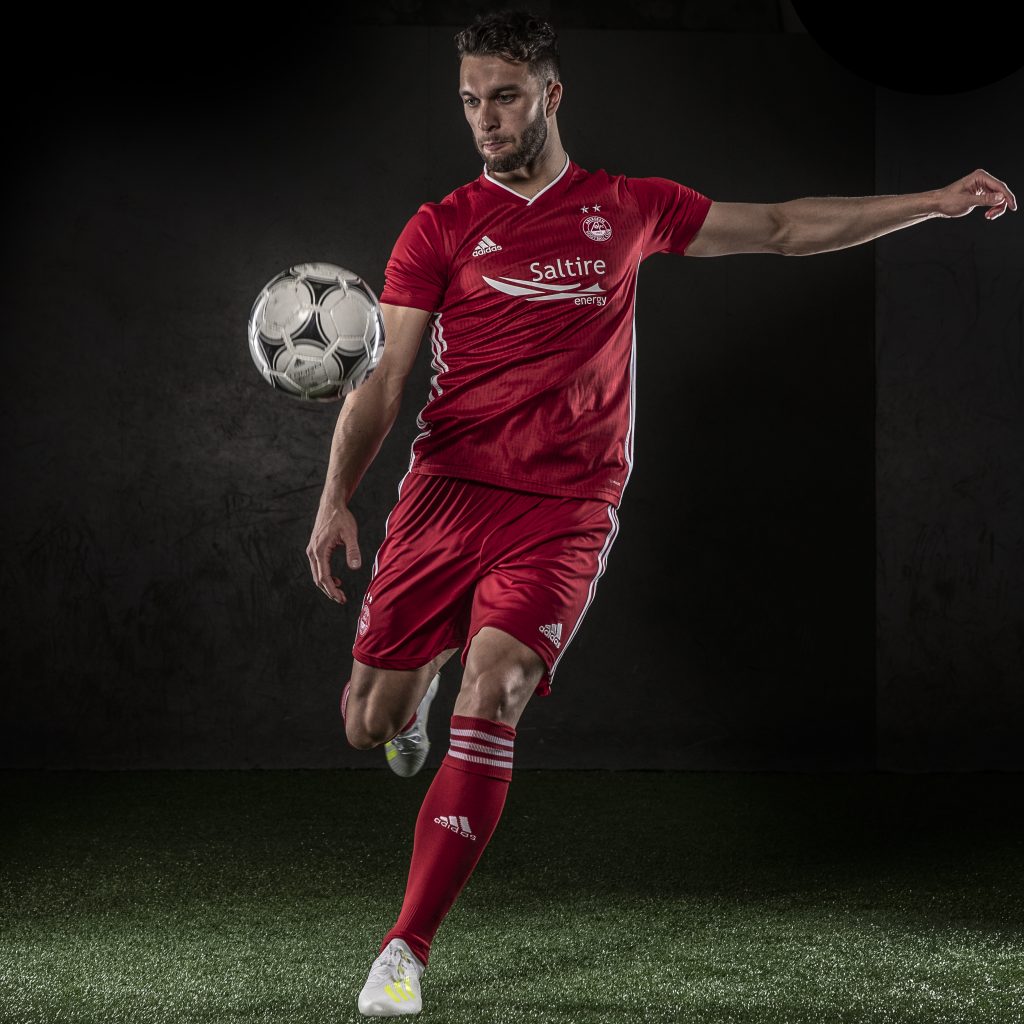 Aberdeen FC’s 2019/20 adidas home uniform is completed with red shorts and socks that both has white details.