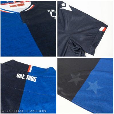 The away jersey features halves in royal and navy blue on its front. Its split v-neck has Forest’s red and white primary collars on its front.
