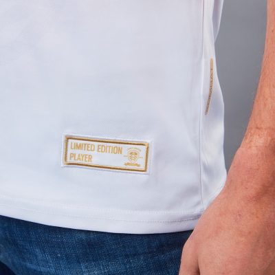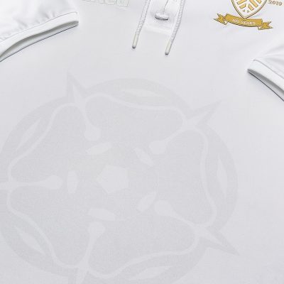 The shirt is in the famous all white of Leeds United with its design inspiration taken from the team’s early jerseys. It has a retro-styled drawstring collar with a tonal print of the Yorkshire Rose on its front.