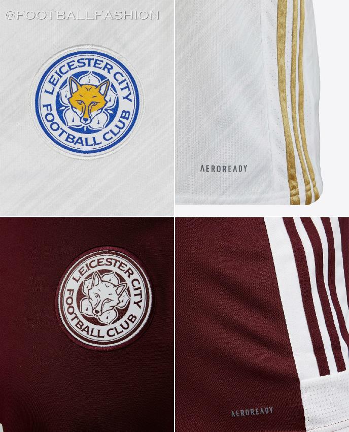 The Leicester City crest is in its normal blue and gold on the white kit. It is monochromatic on the maroon jersey.