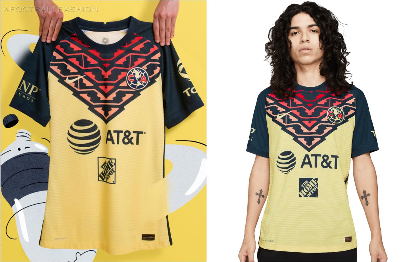 The shirt is in the usual home yellow of Las Águilas (The Eagles) with a chevron-shaped design on its top half. The graphic is an Aztec pattern that changes its base color from deep red to orange. The transition is inspired by the Mexico City sunsets that can be seen from Club América’s Estadio Azteca.